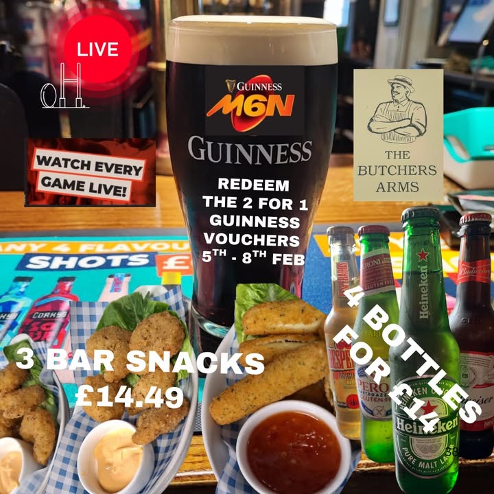 What a night for sport… The Six Nations is BACK 🏉🍺 We’re kicking off Six Nations Championship 2026 live on our big screens with: France v Ireland, tonight | 8:10pm Plus we’re warming things up from 7pm with Premier League Darts, showing live here every Thursday night! Grab the mates and soak up the atmosphere at your local with what many claim is the best pint of Guinness around… plus we’ve got plenty of Guinness Zero ready too. 🥃 Baby Guinness – 2 for £5 📧 Check your emails! If you signed up and received a 2 for 1 Guinness voucher, they must be used from today until 8th Feb 👉 https://butchersarmsbishopsitchington.co.uk/signup/ Add in hot bar snack bundles, bottle beer deals, a roaring fire, and proper sport-night vibes. Wind down your day. Wind up the fun. The fire is on… and tonight is going to be SCRUMptious. 🔥🏉🍻