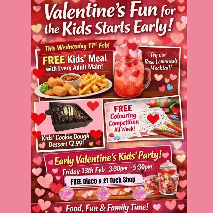 Valentine’s fun for the kids starts early 💖🍽️ SAVE THE DATES: Wednesday 11th Feb, we’re spreading the love with a perfect midweek treat for families: 👧🧒 FREE kids’ meal with every adult main purchased. 🌹 Valentine’s Rose Lemonade Mocktail with floating hearts. 🍪 Finish on a high with kids’ cookie dough dessert for just £2.99!! Book a table now: https://www.butchersarmsbishopsitchington.co.uk 🎨 FREE Valentine’s colouring competition running all week And to round things off… 🎉 An early Valentine’s end-of-school kids’ party: 🗓 Friday 13th, 3:30pm – 5:30pm.🍬 Complete with a Valentine’s sweet tuck shop! Food, fun and happy kids.💕