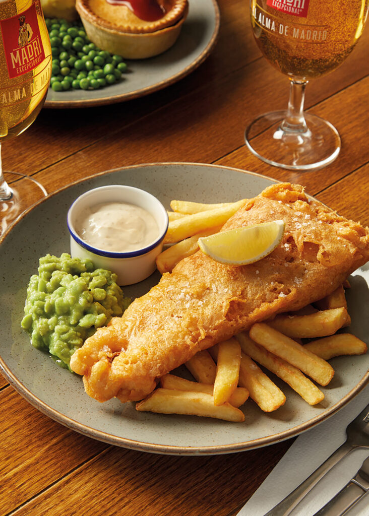 Beer-battered fish & chips, with your choice of garden or mushy peas (†) | 13.29 1095 kcals