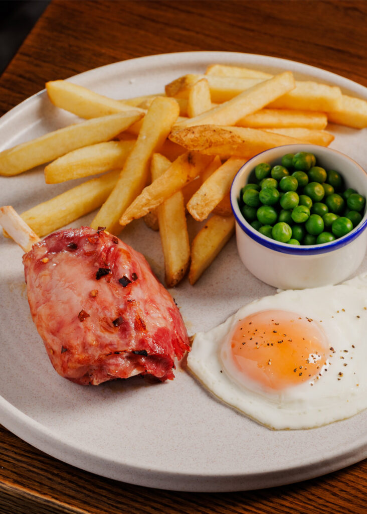 Honey-glazed ham hock, with a free-range fried egg, chips and garden peas | 15.99 1217 kcals