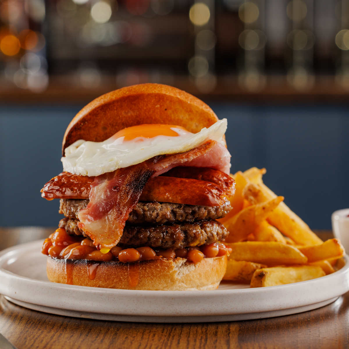 All day breakfast, two pork sausages, two bacon rashers, two free-range fried eggs, grilled tomato, mushrooms, chips and baked beans | 13.29 1270 kcals