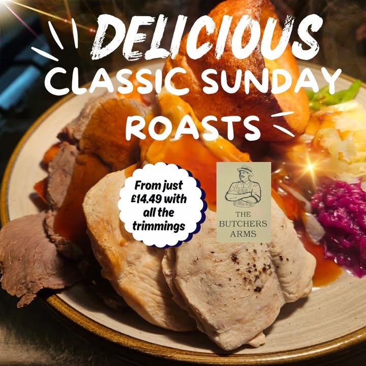 🎉 Book your Sunday now: https://www.butchersarmsbishopsitchington.co.uk Your home of entertainment & award winning food & drink at great value. Mouthwatering roasts & classic pub grub (kitchen open until 8pm), to live entertainment that keeps the weekend vibes going even longer. 🙌 Bring the friends, the family (even the 4 legged kind for our doggy menu 🐾). Sundays are best spent right here. 01926 351784 https://www.butchersarmsbishopsitchington.co.uk